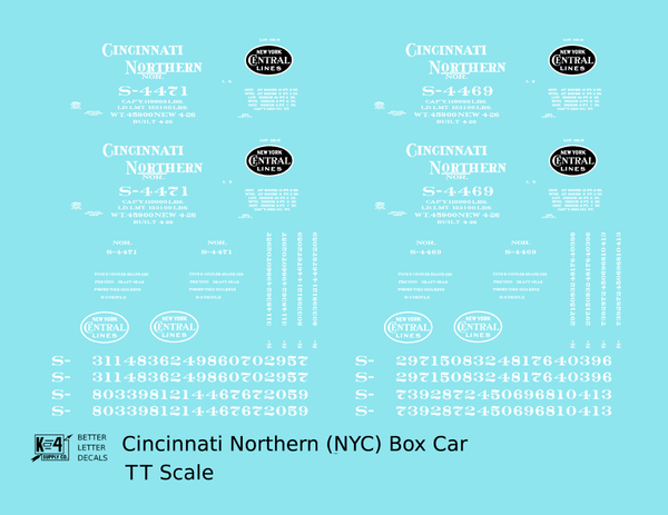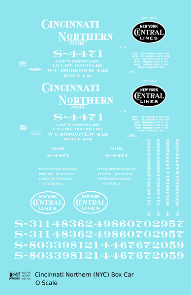 > Cincinnati Northern 40 Ft Boxcar White New York Central - Decal - Choose Scale