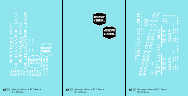 Mississippi Central 40 Ft Boxcar White - Decal - Choose Scale
