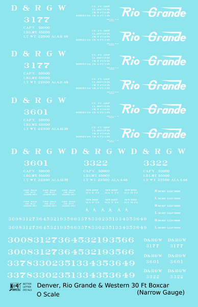 > Rio Grande 30 Ft Narrow Gauge Boxcar White - Decal - Choose Scale