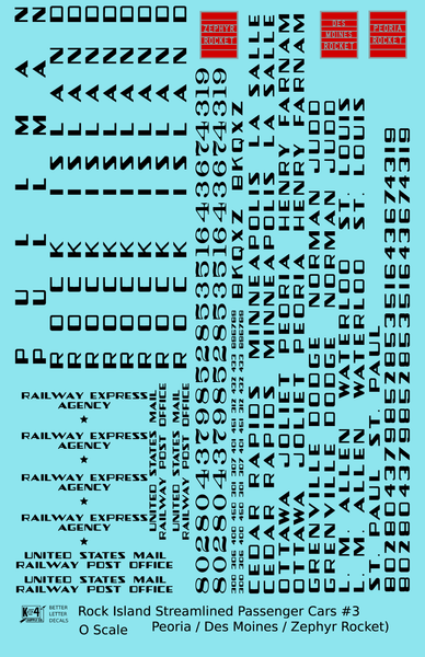 > Rock Island Streamlined Passenger Car Black Peoria/Des Moines/Zephyr Rocket - Decal - Choose Scale