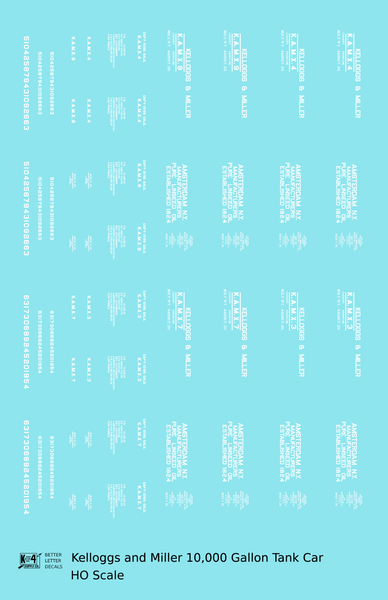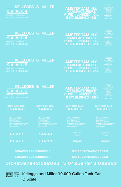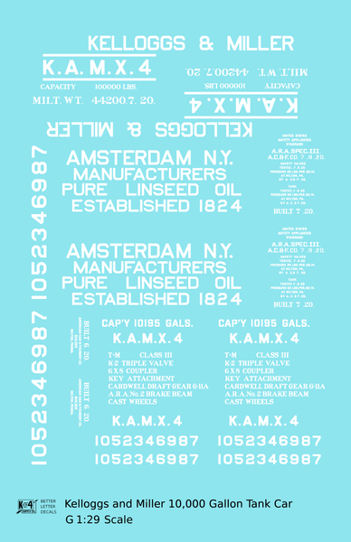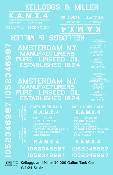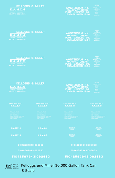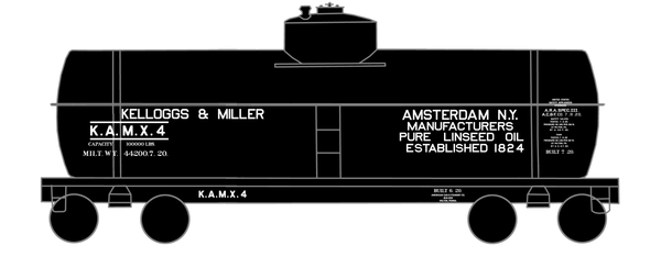 > Kelloggs and Miller Linseed Oil Tank Car White Amsterdam, NY - Decal - Choose Scale