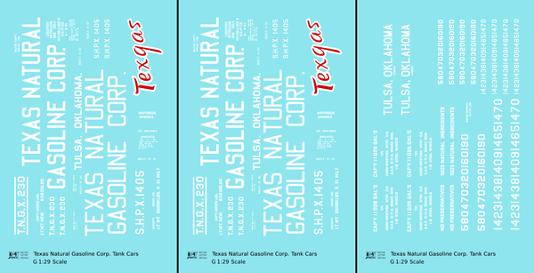 Texas Natural Gasoline Corp ICC-105 Tank Car White and Red Texgas - Decal - Choose Scale