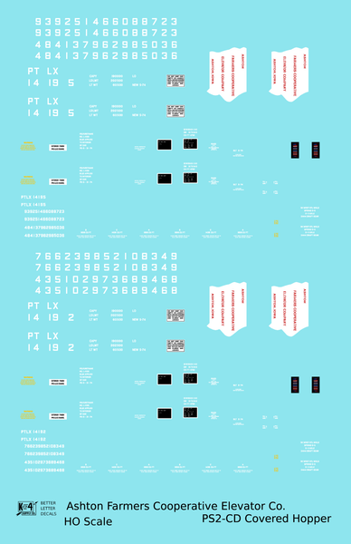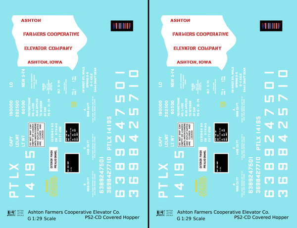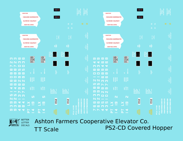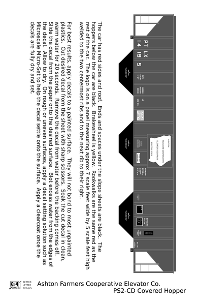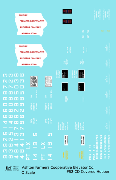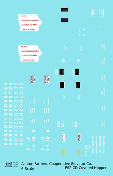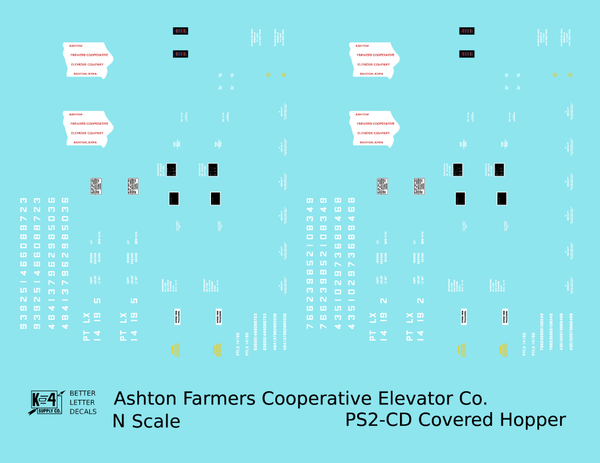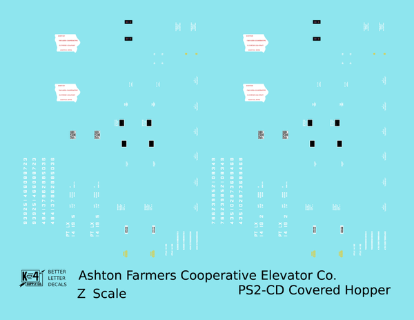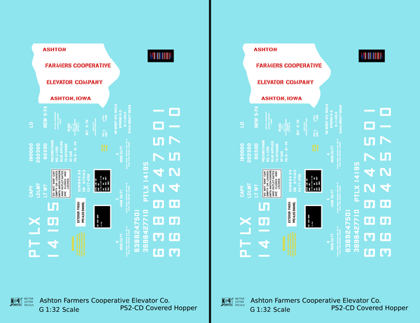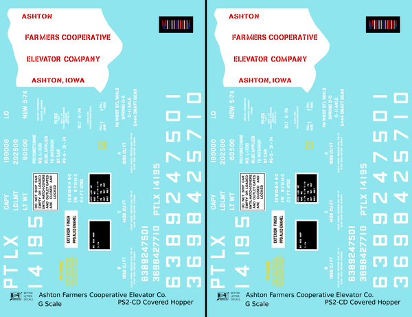 Ashton Iowa Cooperative Elevator PS2-CD Covered Hopper White - Decal - Choose Scale