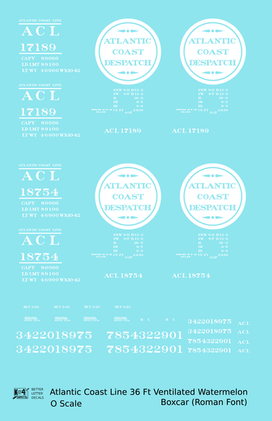 Atlantic Coast Line Despatch 36 Ft Watermelon Boxcar Roman Font - Decal - Choose Scale
