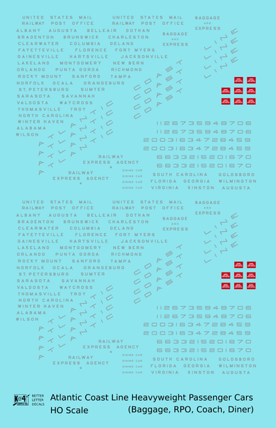 Atlantic Coast Line Heavyweight Passenger Car Silver Coach Baggage RPO - Decal - Choose Scale