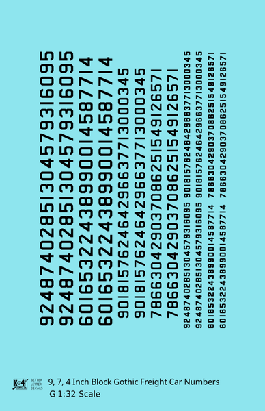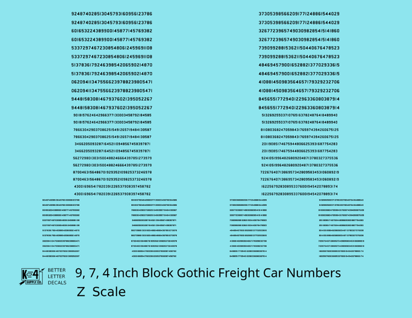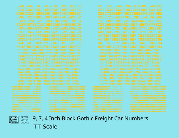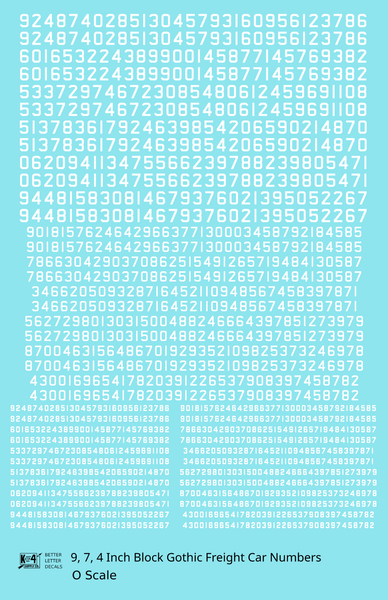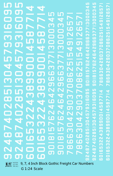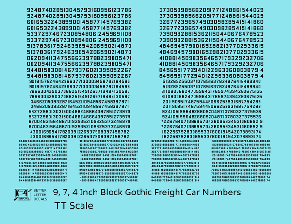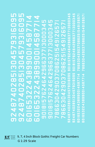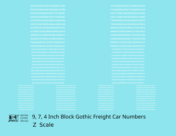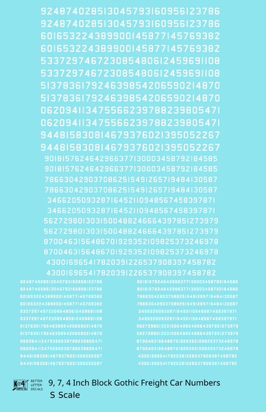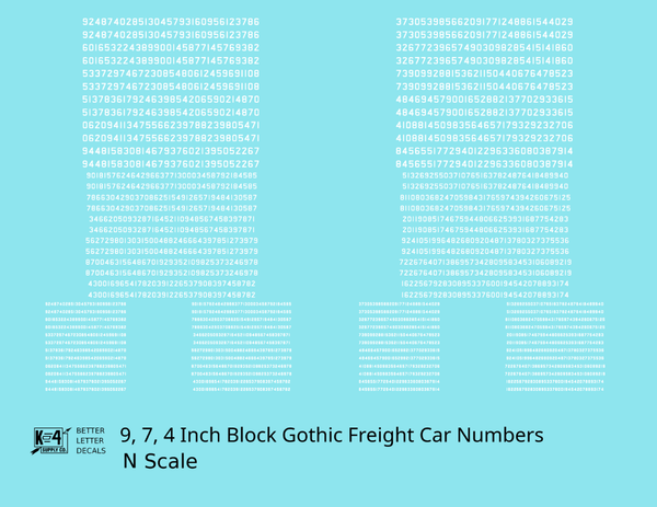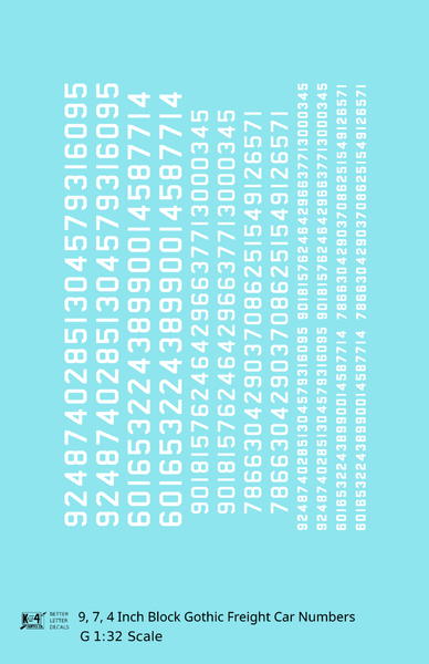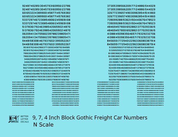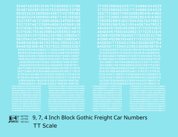 Block Gothic Freight Car Numbers White 9, 7 and 4 Inch Renumber - Decal - Choose Scale and Color
