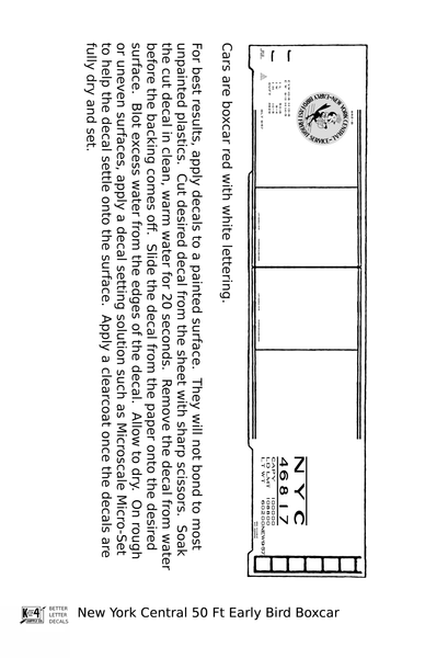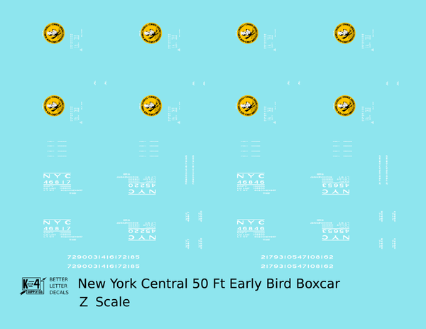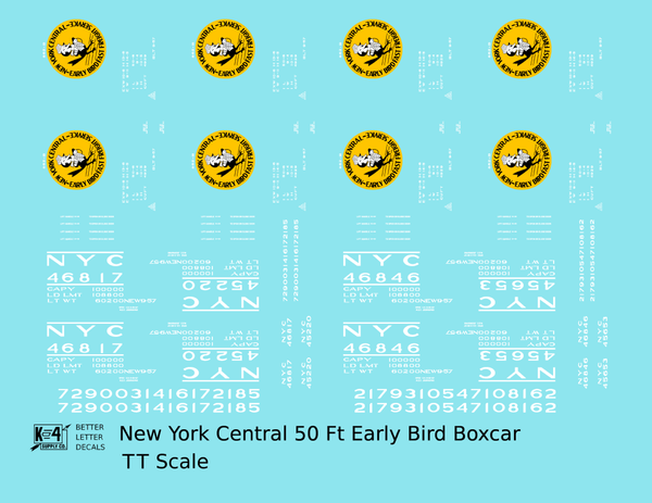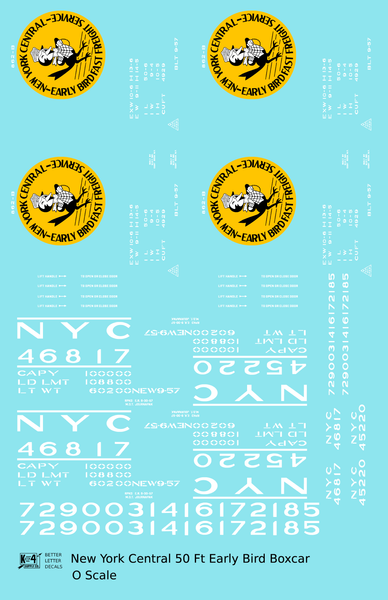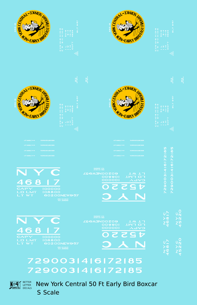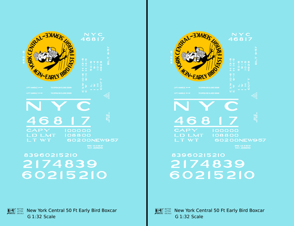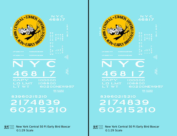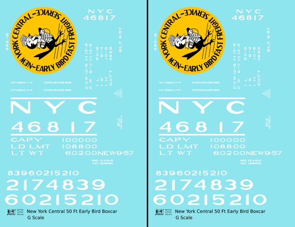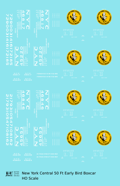 New York Central 50 Ft Boxcar Yellow, Black and White Early Bird - Decal - Choose Scale